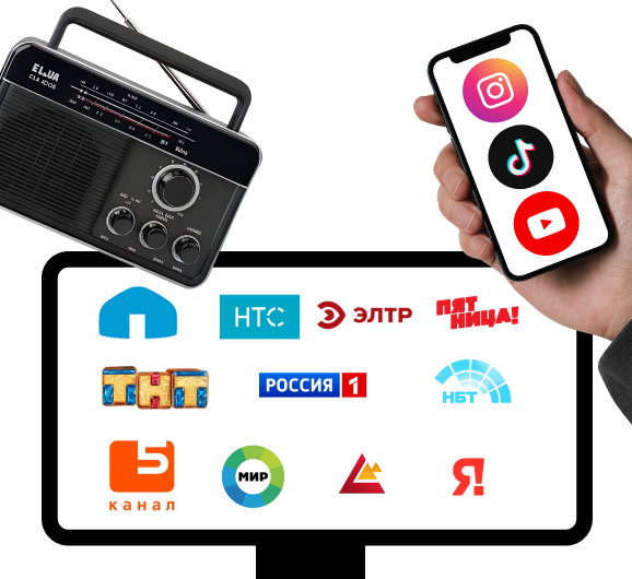 Рекламные кампании на телевидении, радио и через блогеров. Достигайте свою аудиторию там, где она проводит время.